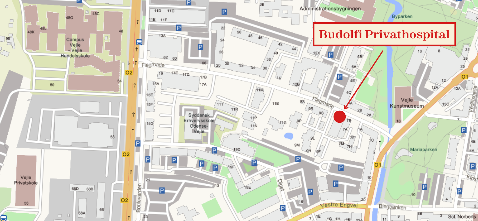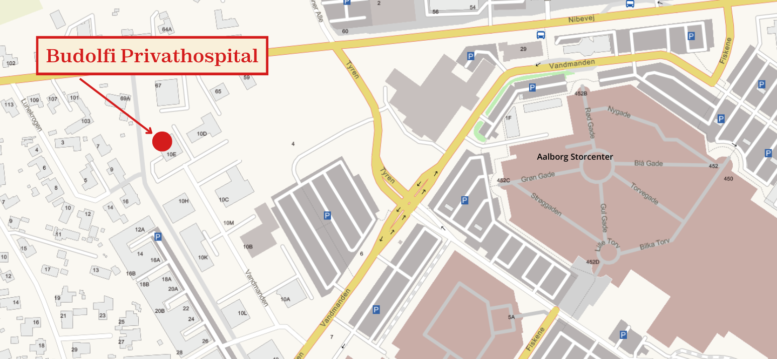 Privathospitalet er placeret i Aalborg City Syd. Kommer du i bil, er der rig mulighed for gratis parkering både ved privathospitalet og i det omkringliggende område. Vi holder til i en kubisk hvid bygning, lige ved siden af Dyrehospitalet. Vores reception ligger på 1. Sal.