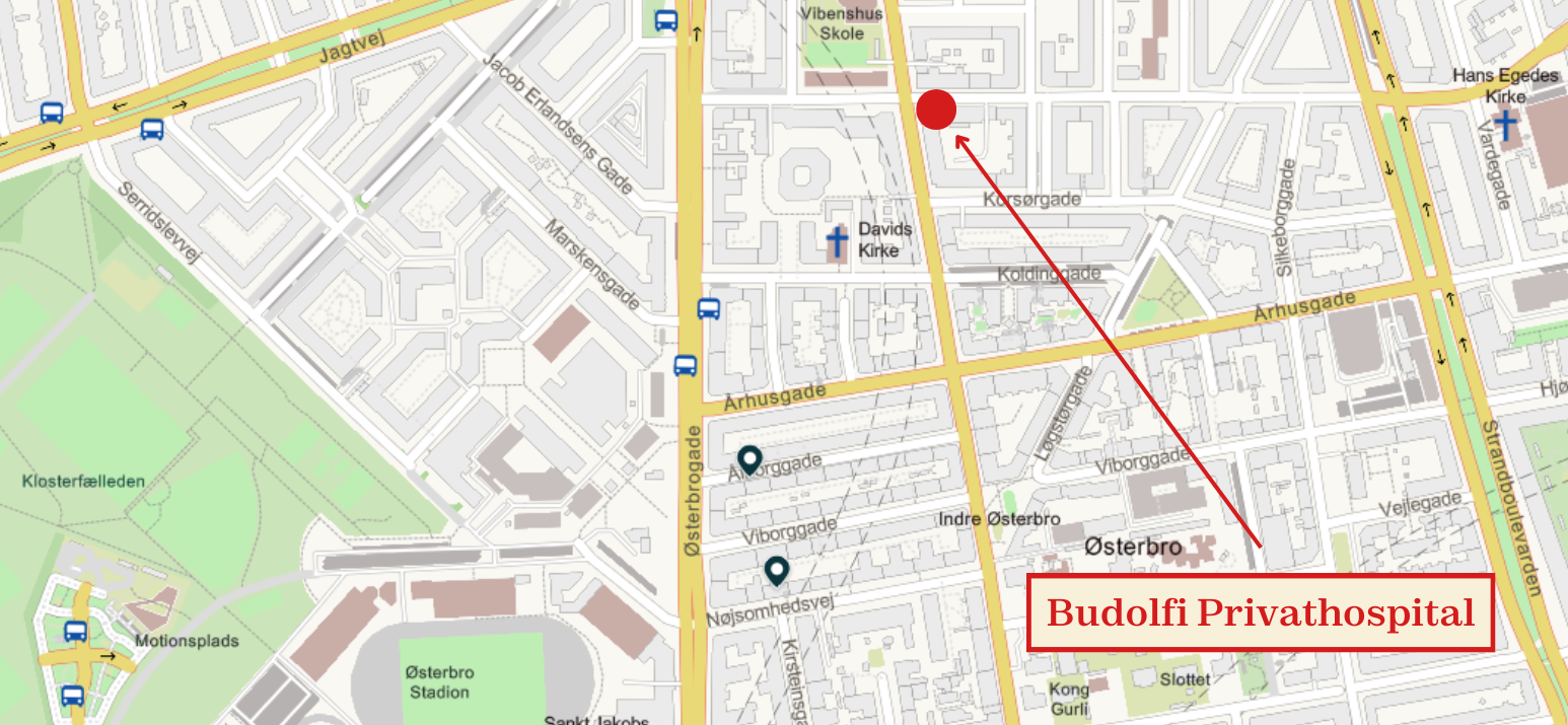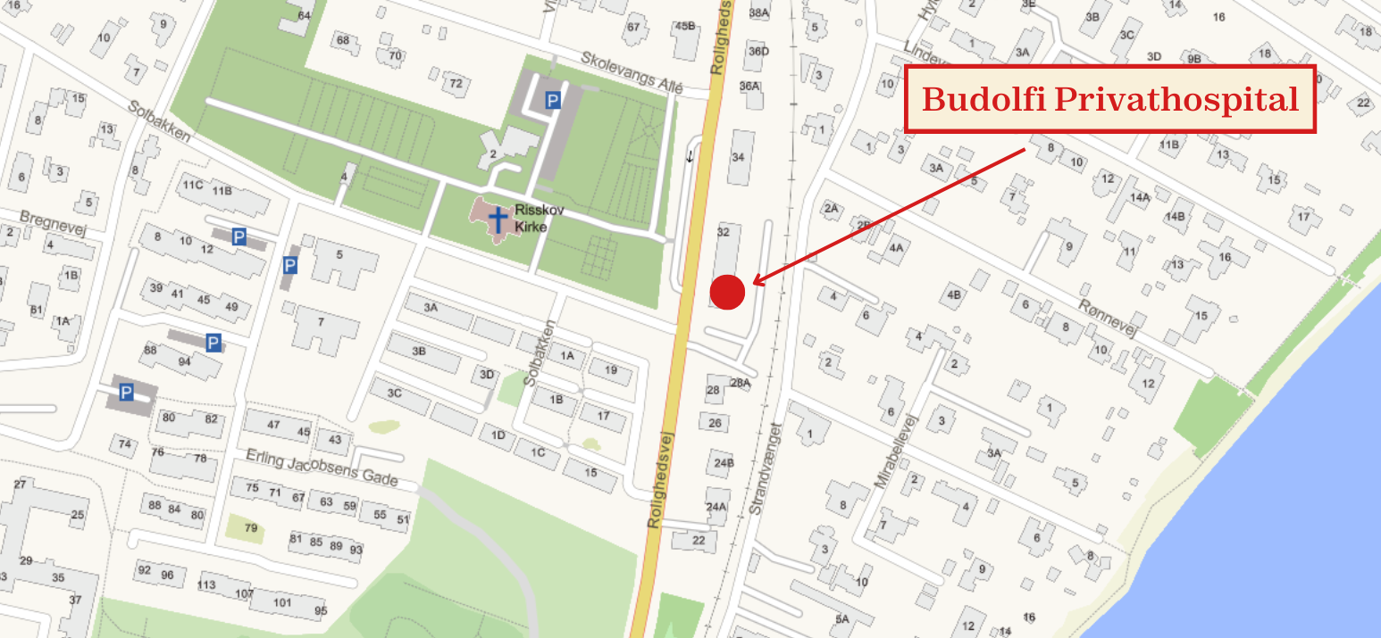 Privathospitalet er placeret i Risskov lige nord for Aarhus. Kommer du i bil, er der gratis parkering både ved bagved og foran privathospitalet. Vi holder til i en rød murstensbygning, lige overfor Risskov Kirke.